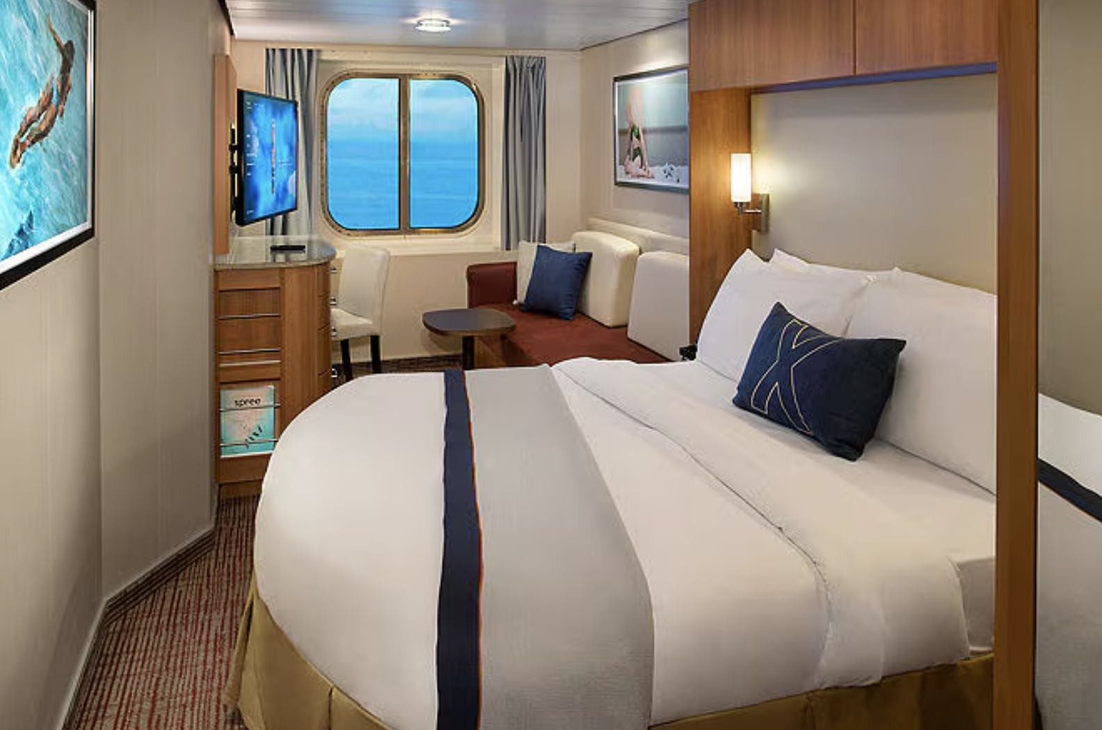 An Ocean View Stateroom on the Celebrity Equinox features a large window offering expansive ocean views, two twin beds convertible to a queen-size bed, a comfortable sitting area with a desk and vanity, ample closet space, a private bathroom with shower, and standard amenities like a flat-screen TV, mini-bar, and Celebrity's signature eXhale bedding, allowing guests to enjoy the sea vistas while relaxing in a well-appointed cabin space.